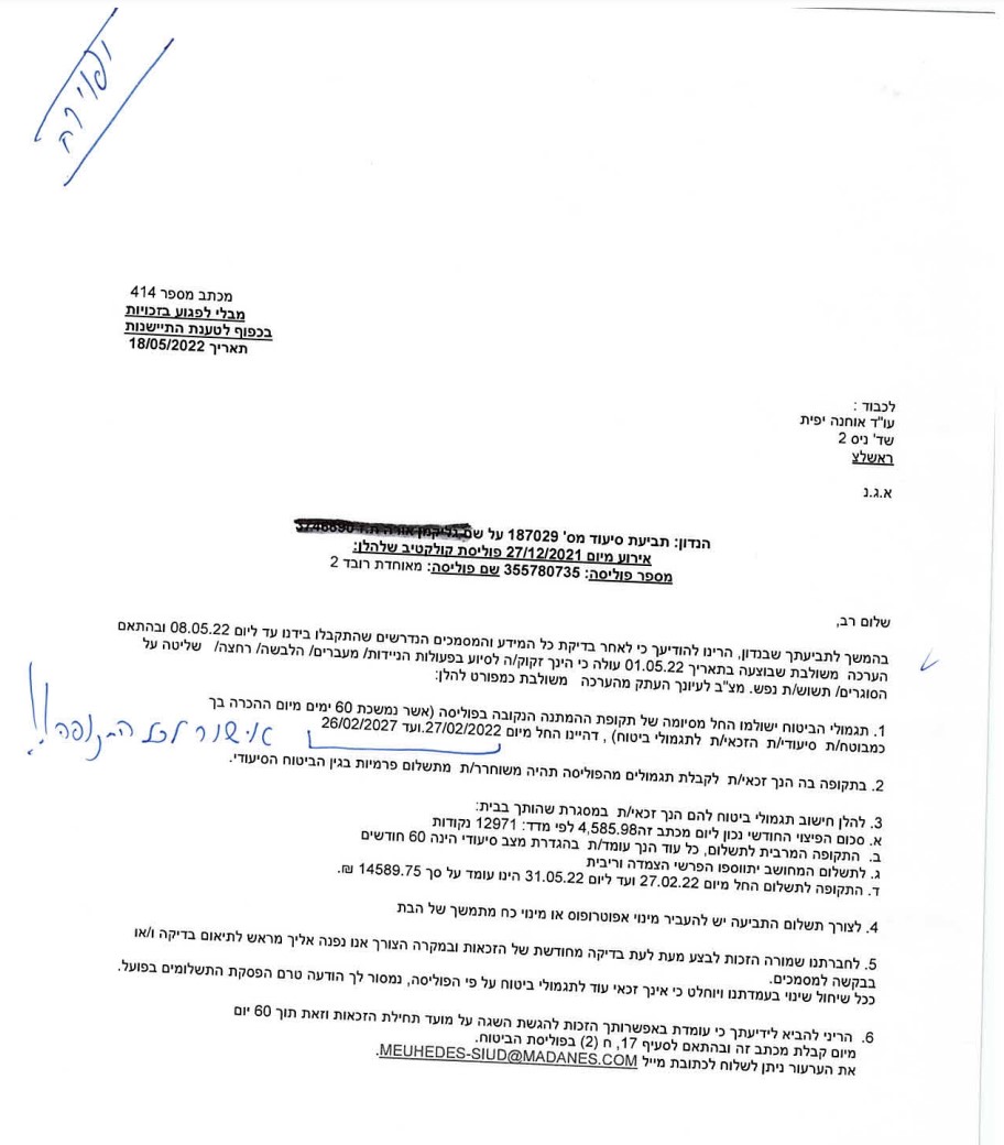 לאחר הגשת התביעה, יקבל המבוטח מודע בדיקה מחברת הביטוח המבוצעת בביתו של המבוטח כדי שרופא יגיע ויעיריך את מצבו הרפואי. עו"ד מתלווה לפגישה כדי למקסם את סיכויו של המבוטח.